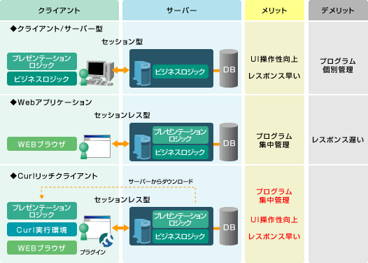 以下に、クライアント/サーバ型システム、現状のWEBシステムとCurlリッチクライアントシステムとの違いを示します。